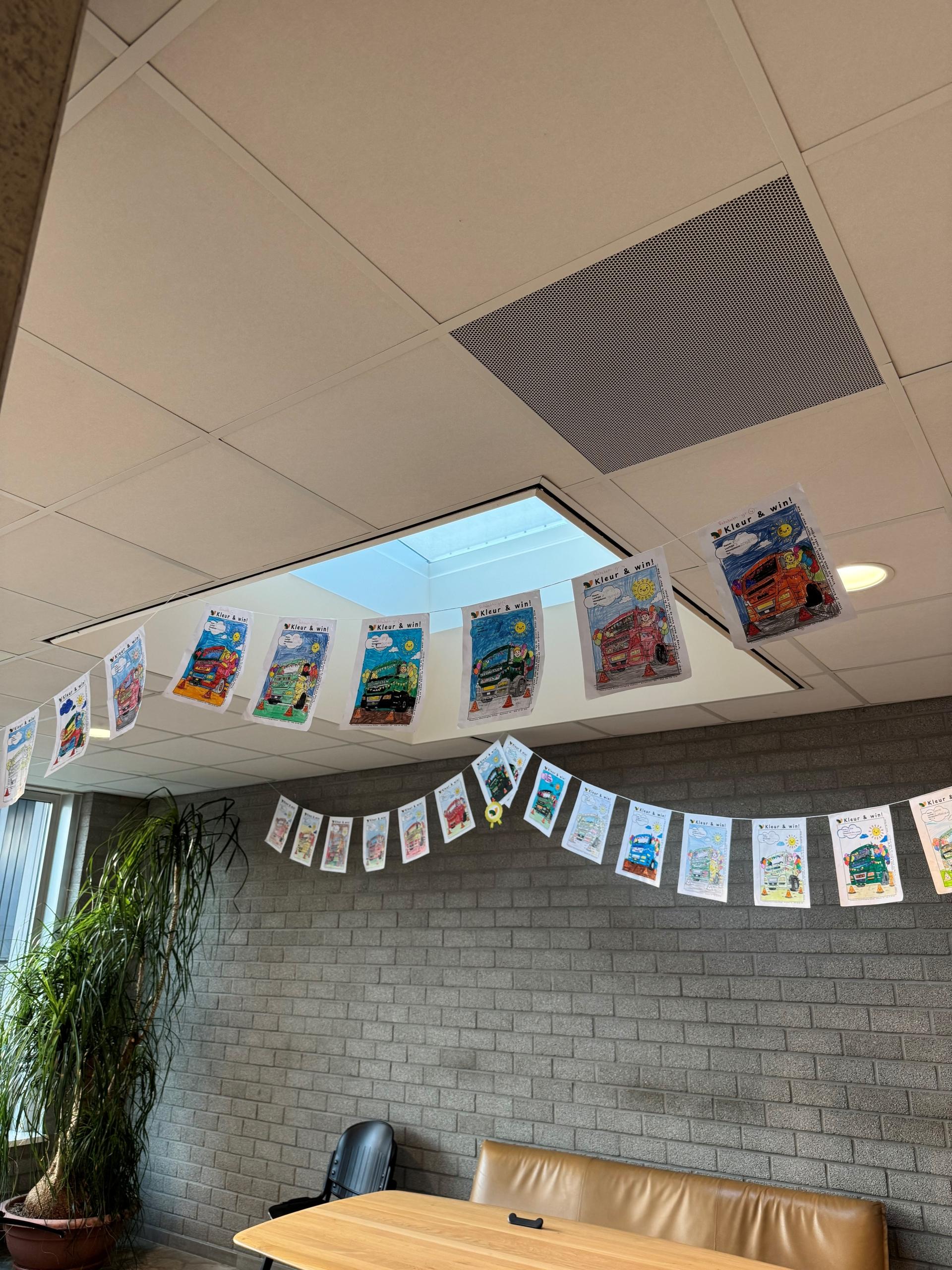 Onze kantine is vrolijk versierd met alle kleurplaten, en ze zullen zeker nog even blijven hangen. Op donderdagmiddag kon het hele bedrijf genieten van een heerlijk frietje van Elbollo foodtruck.🍟 Daarnaast kwamen de winnaars van de kleurplatenactie, samen met hun broertjes en zusjes (en ouders), langs om hun prijs in ontvangst te nemen. Het was een gezellige middag en een mooie afsluiting. 🎉♻️